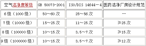 (一)在各国的洁净室标准中,相同级别的非单向流洁净室的经验换气次数并不相同。我国《洁净厂房设计规范》(GB50073-2001)中明确规定了不同级别的非单向流洁净室洁净送风量计算所需的经验换气次数,